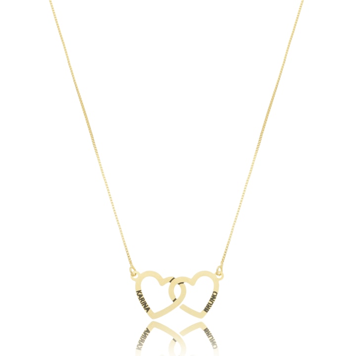 O Colar Corações Entrelaçados simboliza o encontro de duas vidas que se complementam. Com pingentes vazados em formato de coração interligados e personalizados com nomes, essa joia representa laços fortes, amor verdadeiro e histórias que caminham juntas.