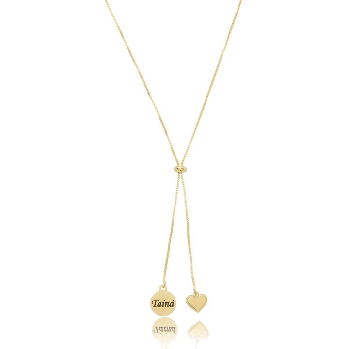 Este colar gravatinha combina elegância e afeto com dois pingentes em formato de coração: um liso com nome personalizado e outro com acabamento detalhado. A corrente ajustável estilo gravatinha permite um caimento moderno e versátil, ideal para compor looks com personalidade.