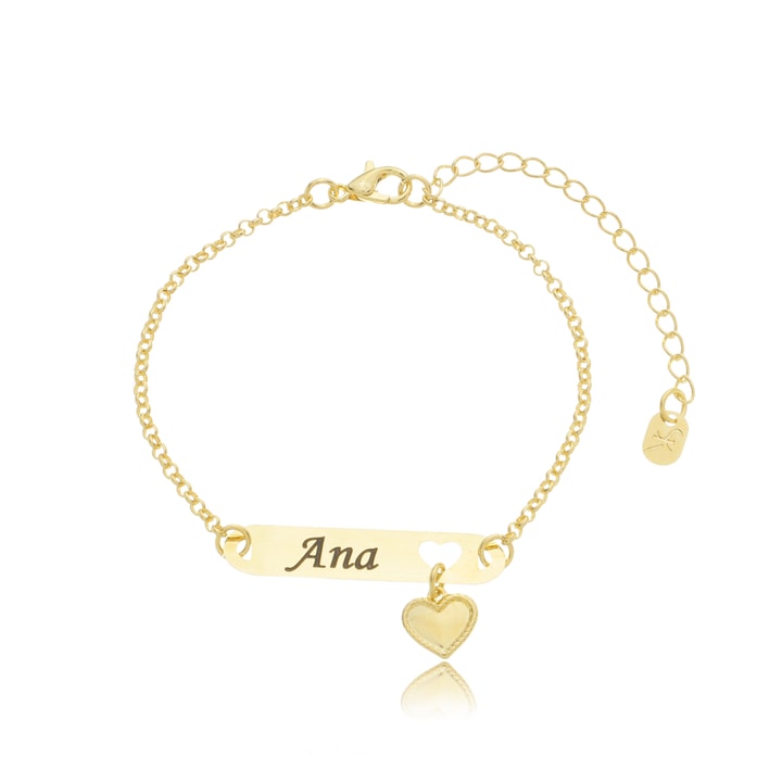 A pulseira personalizada Ana é uma joia encantadora que une a sofisticação da plaquinha com nome gravado ao charme de um pingente de coração pendurado, simbolizando afeto e conexão. Ideal para presentear ou eternizar um nome especial com elegância.